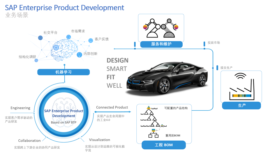 SAP EPD 是一個集成的產(chǎn)品生命周期管理云解決方案,它利用機器學習技術(shù),可自動識別,分類和分析產(chǎn)品反饋?;诜治鼋Y(jié)果,產(chǎn)品研發(fā)部門可以更輕松地將客戶反饋轉(zhuǎn)化成產(chǎn)品需求,搭建系統(tǒng)模型,進行模擬仿真及測試,生成工程物料清單,進而提交生產(chǎn),投放市場, 最后進入運維階段。